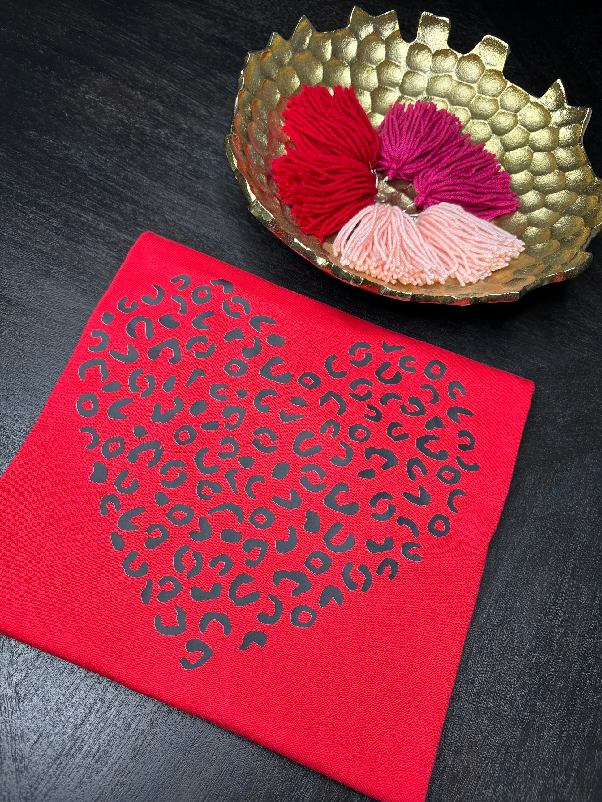 This red Valentine’s shirt featuring a cheetah-print heart is perfect for those who love to stand out. The vibrant red shirt paired with a trendy animal-print heart creates the ultimate statement piece for Valentine’s Day and beyond.